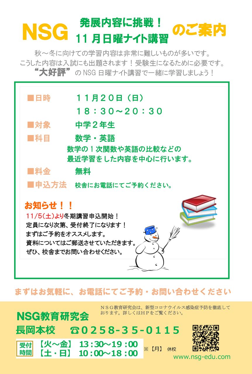 【長岡本校】中2生 11月日曜ナイト講習のご案内